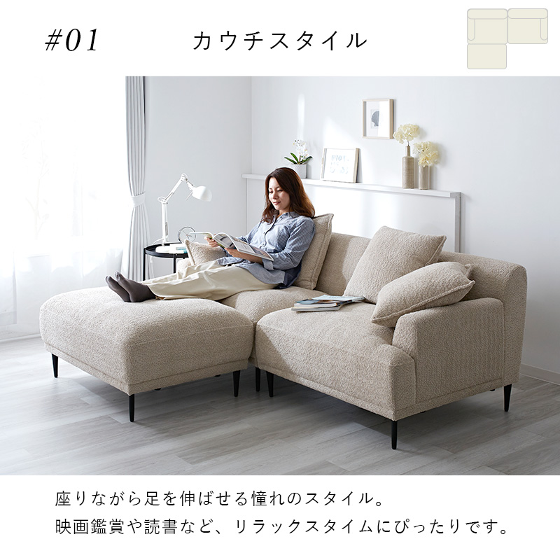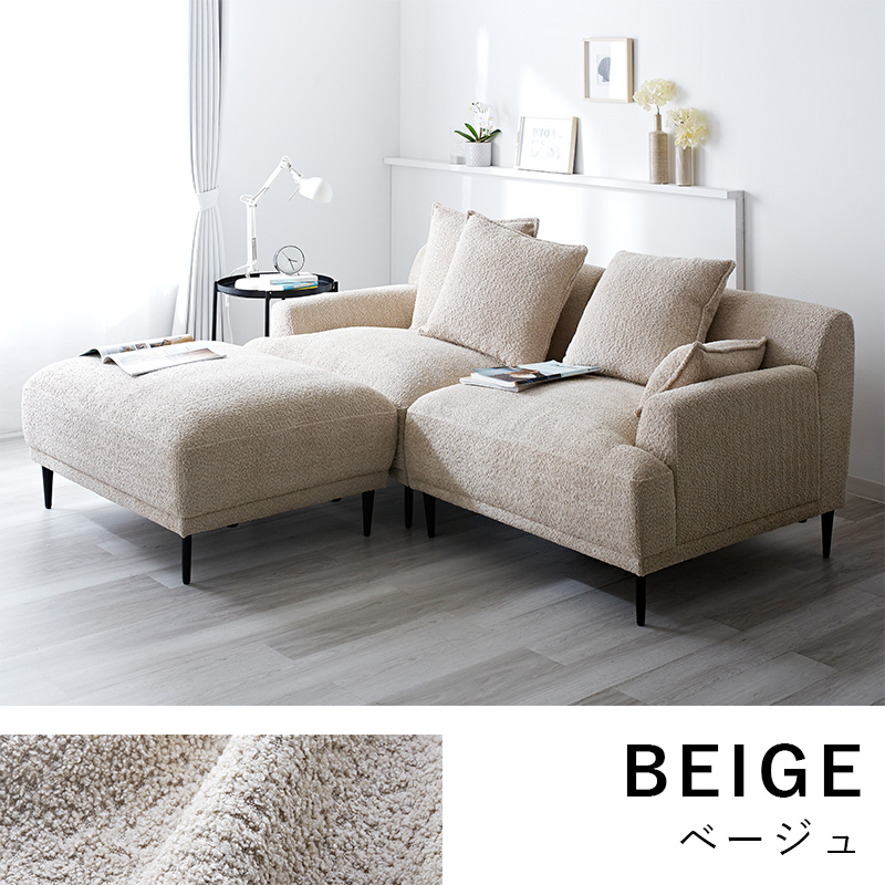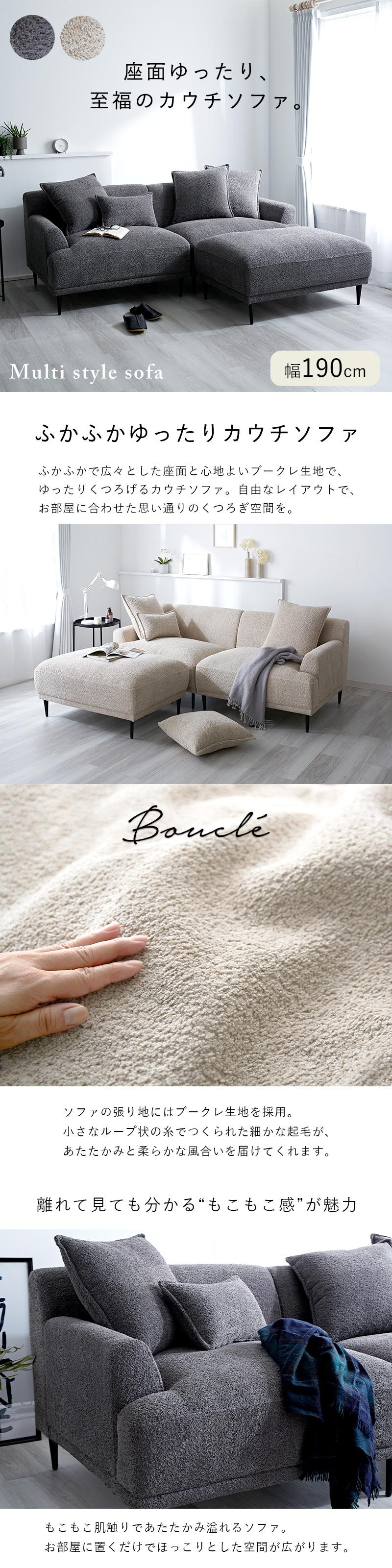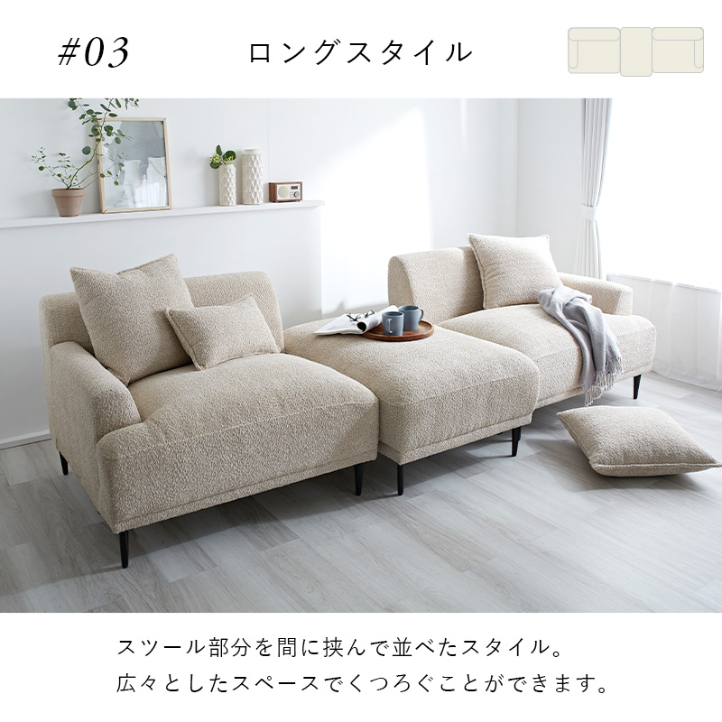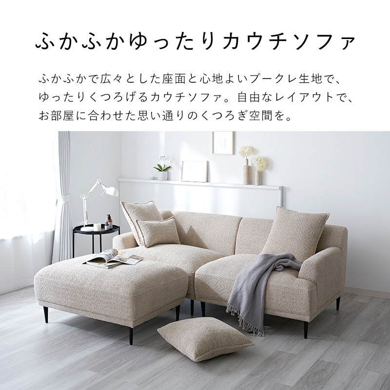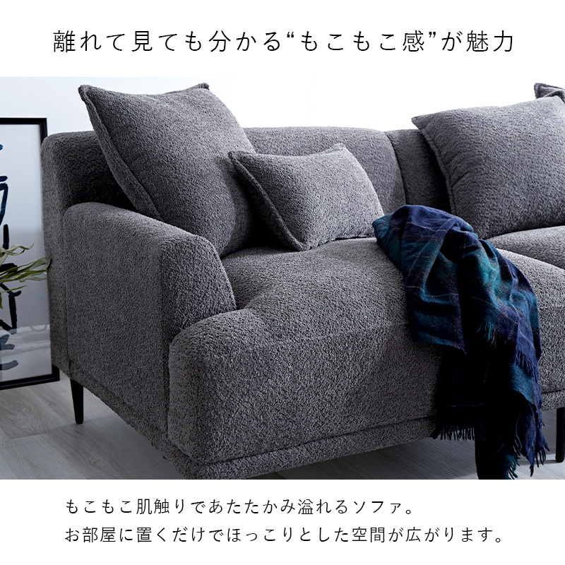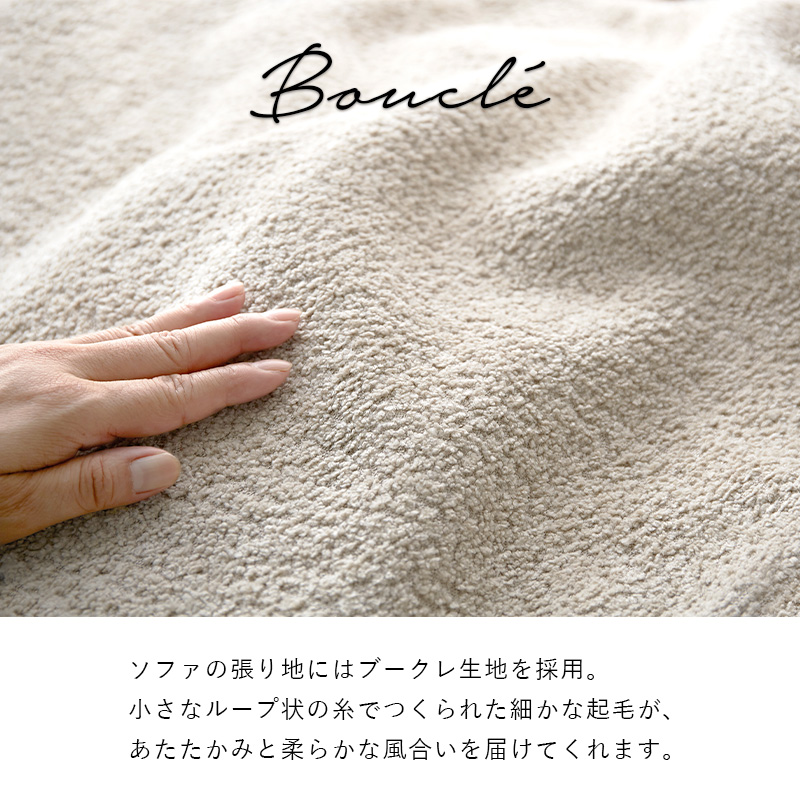 | 開放感にあふれる広々とした座面と自由自在のシートレイアウト。 それぞれのお部屋の事情に合わせてフィットするソファになります。 モコモコ肌触りで暖かみ溢れるソファ。 お部屋に置くだけでほっこりとした空間が広がります。 ソファの張り地にはブークレ生地を採用。 小さなループ状の糸の輪で作られた細やかな起毛による温かみと柔らかな風合いが魅力です。 どの場所に座っても気持ち良く、是非お試し頂きたい生地です。 | |