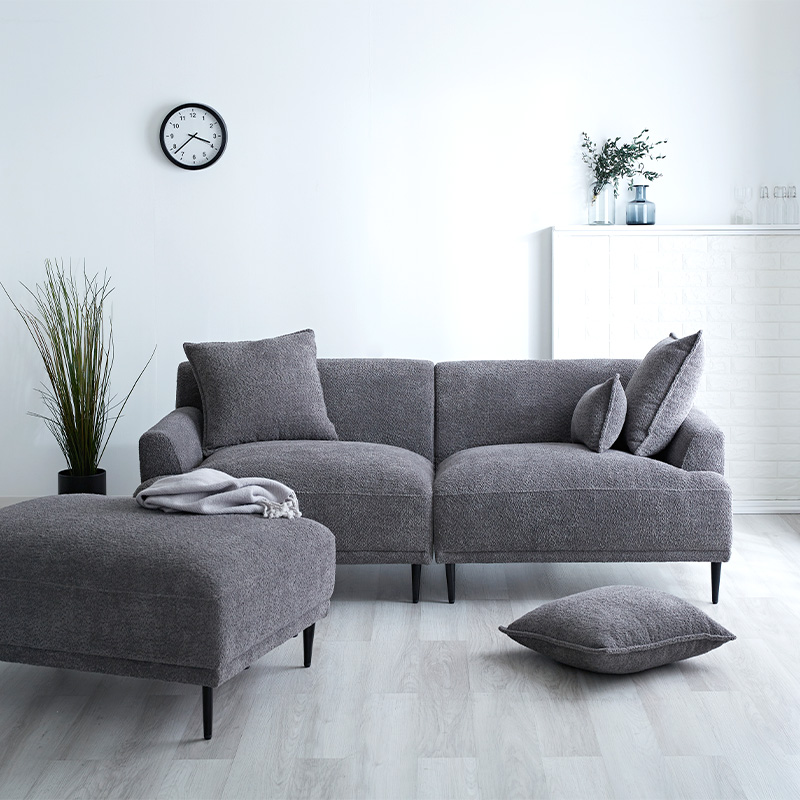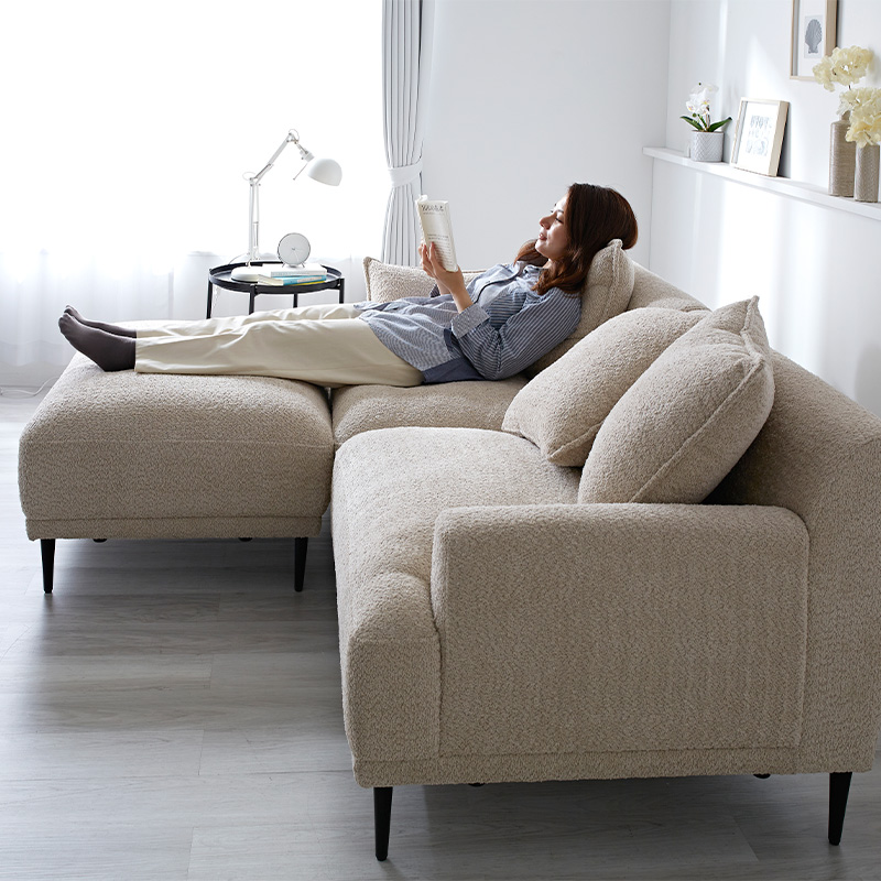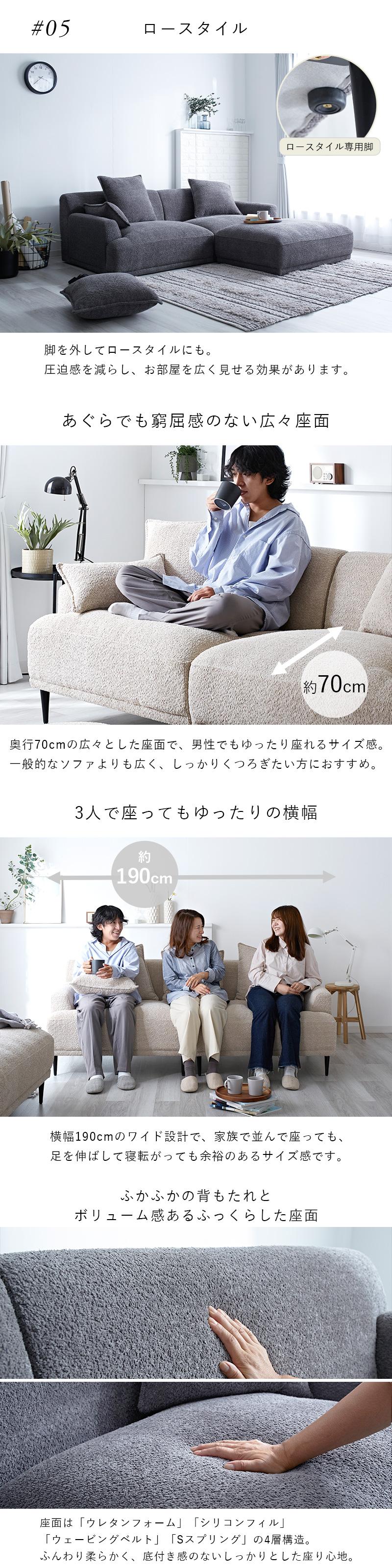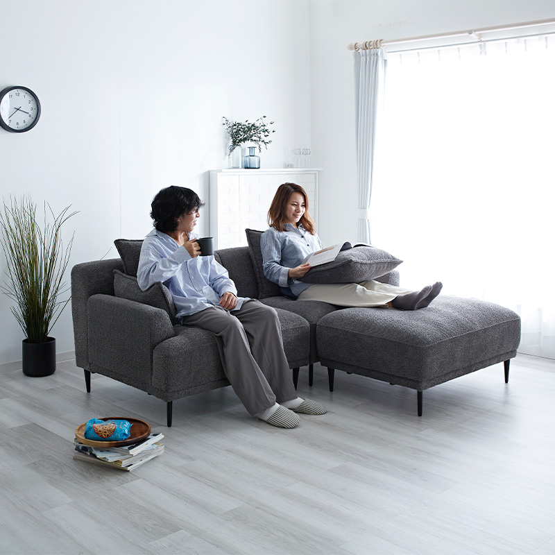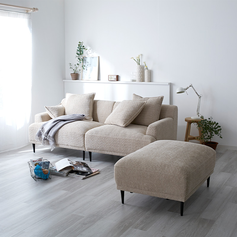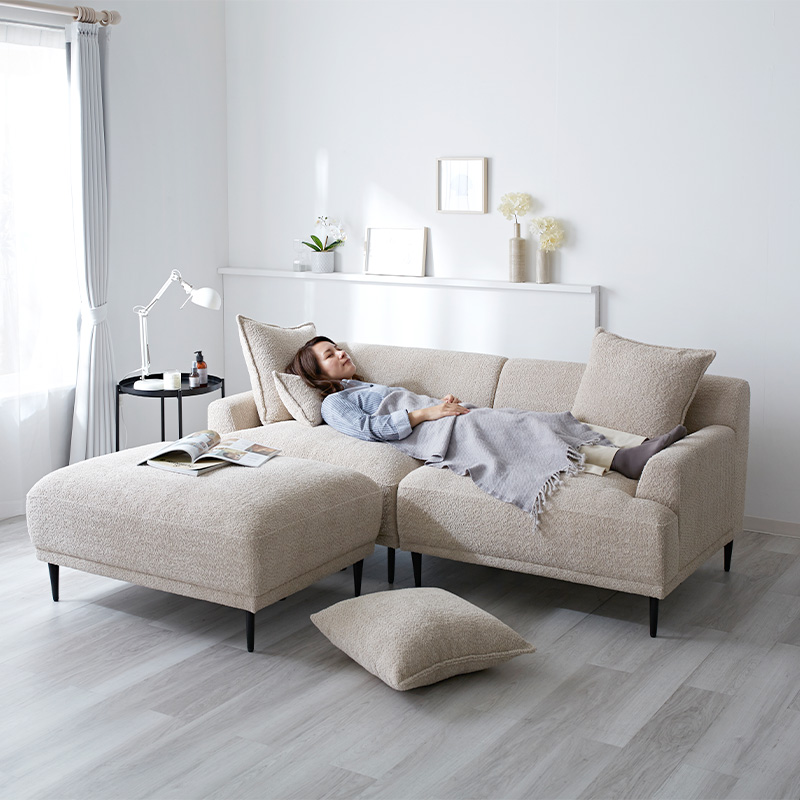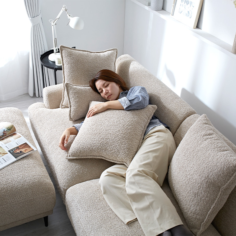 | 開放感にあふれる広々とした座面と自由自在のシートレイアウト。 それぞれのお部屋の事情に合わせてフィットするソファになります。 モコモコ肌触りで暖かみ溢れるソファ。 お部屋に置くだけでほっこりとした空間が広がります。 ソファの張り地にはブークレ生地を採用。 小さなループ状の糸の輪で作られた細やかな起毛による温かみと柔らかな風合いが魅力です。 どの場所に座っても気持ち良く、是非お試し頂きたい生地です。 | |