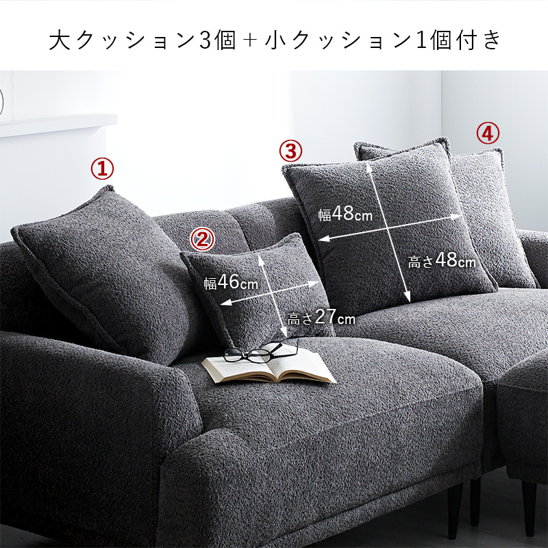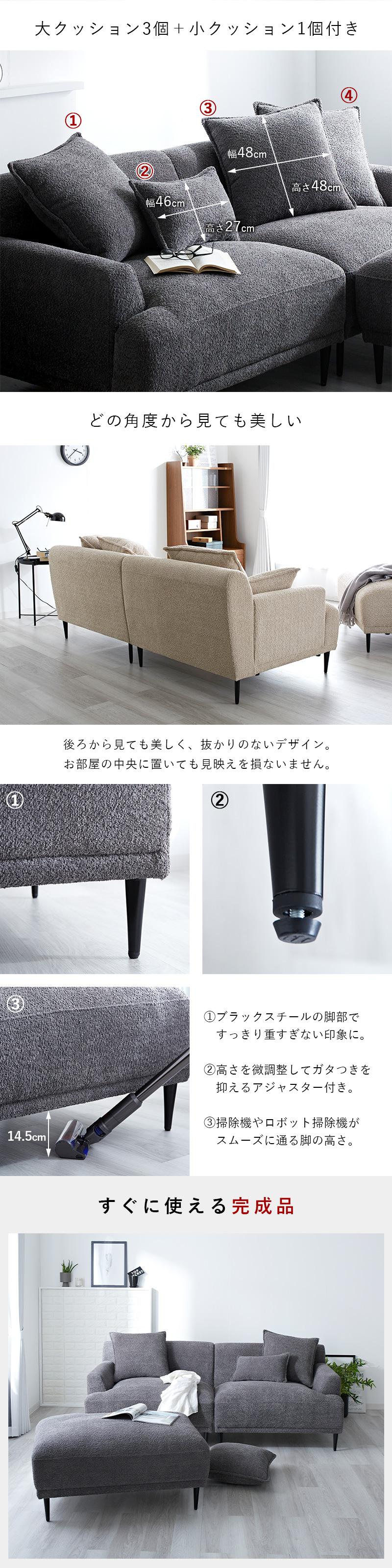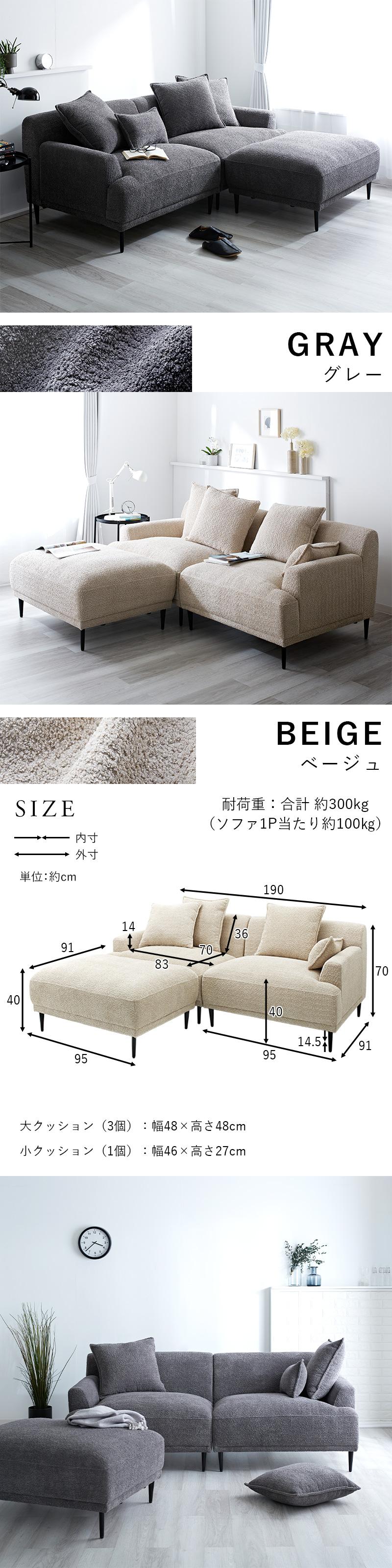| 商品サイズ | 右肘ソファ:(約)幅95cm×奥行き91cm×高さ70(座面40)cm 左肘ソファ:(約)幅95cm×奥行き91cm×高さ70(座面40)cm スツール:(約)幅95cm×奥行き70cm×高さ40cm |