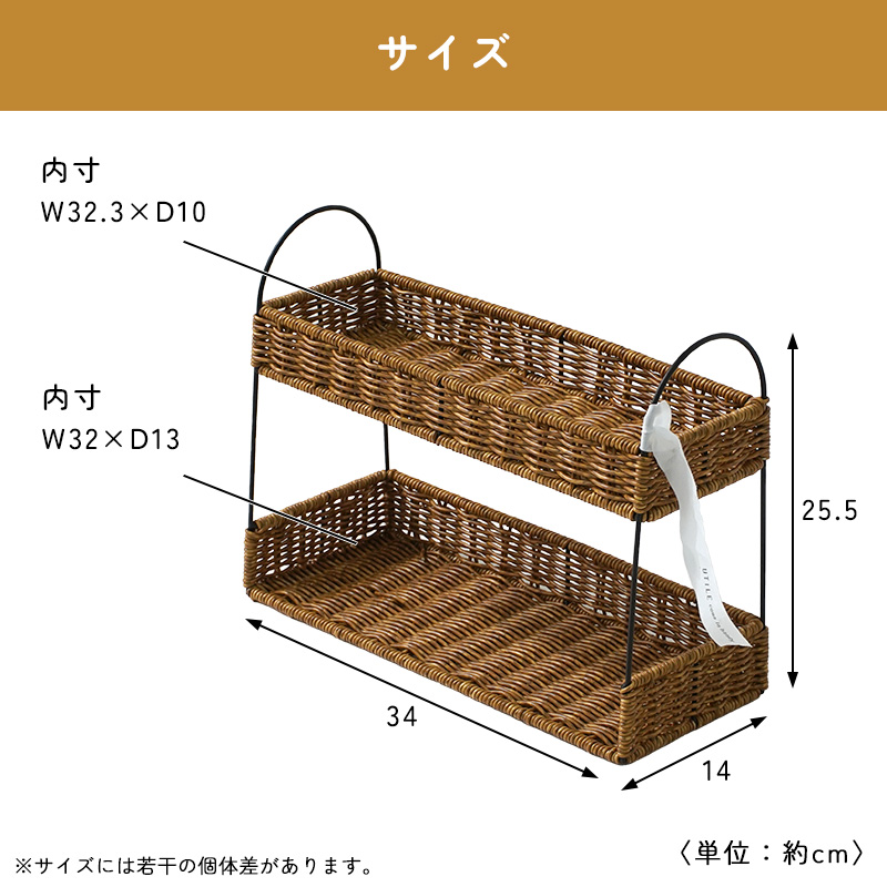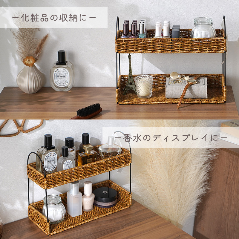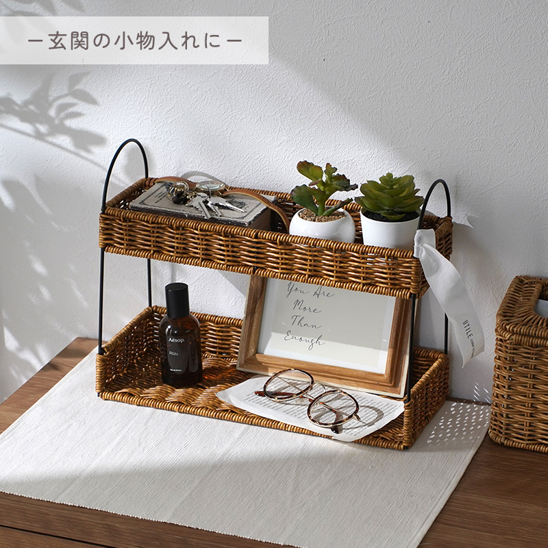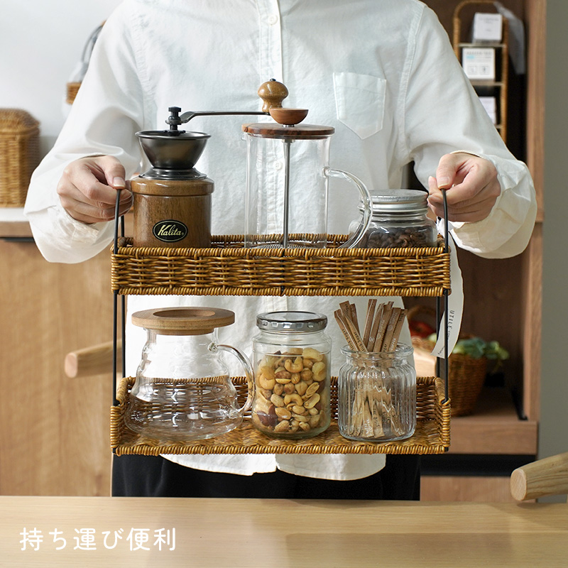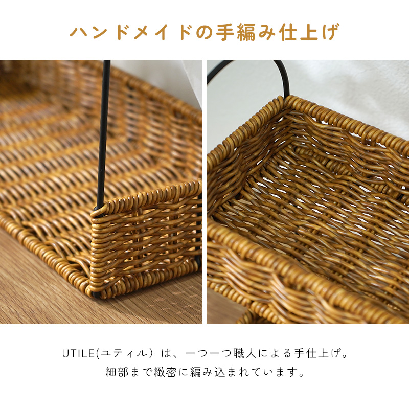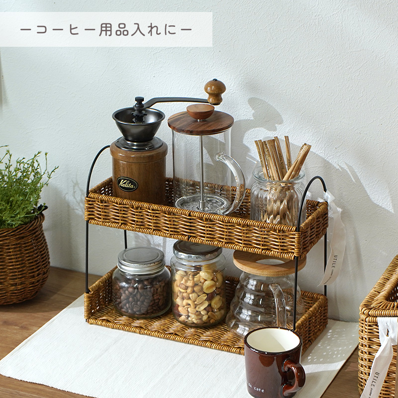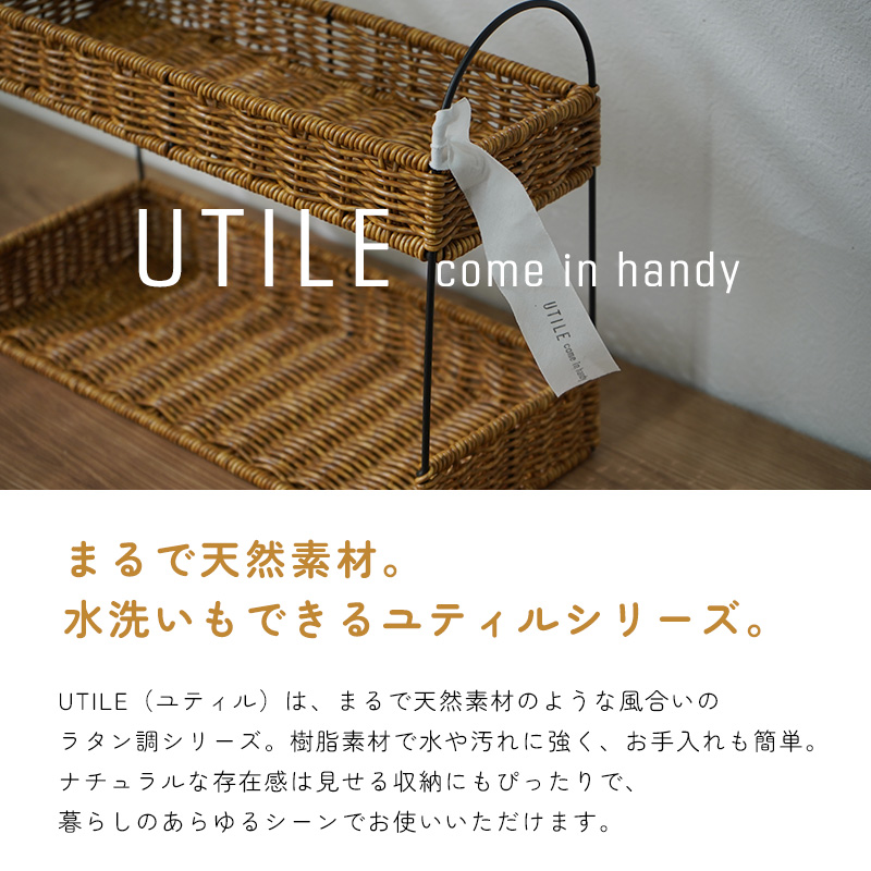 | まるで天然素材のような風合いと、水洗いできる手軽さが魅力のUTILE(ユティル)シリーズ。 ラタン調に編み込んだポリプロピレン・ポリエチレン素材を使用しており、水や汚れに強く、お手入れも簡単。ナチュラルであたたかみのあるデザインは、見せる収納にもよく馴染みます。 キッチンスペースを有効活用できる2段ラック。 ジャムやスパイス、コーヒー用品などの小物収納に最適です。 キッチン収納はもちろん、玄関の小物入れとしても活躍します。 ドレッサー周りでは、香水や化粧品を並べておしゃれなディスプレイ収納としてもお使いいただけます。 | |