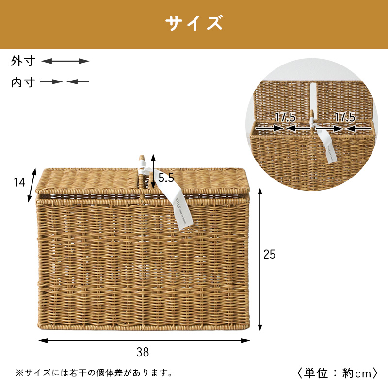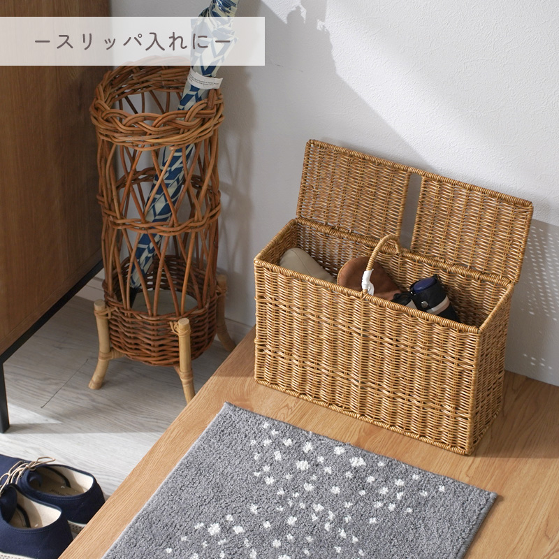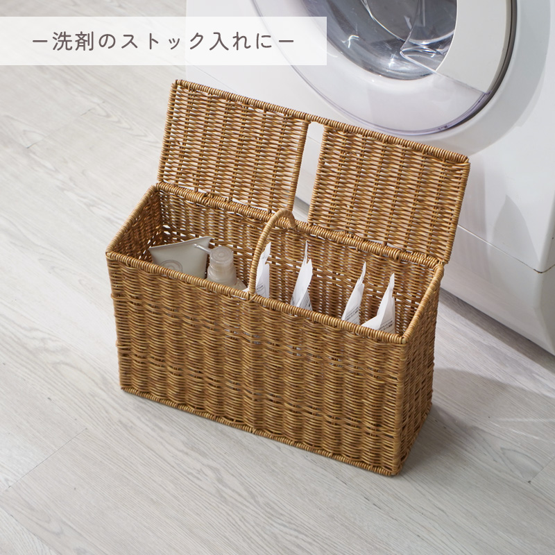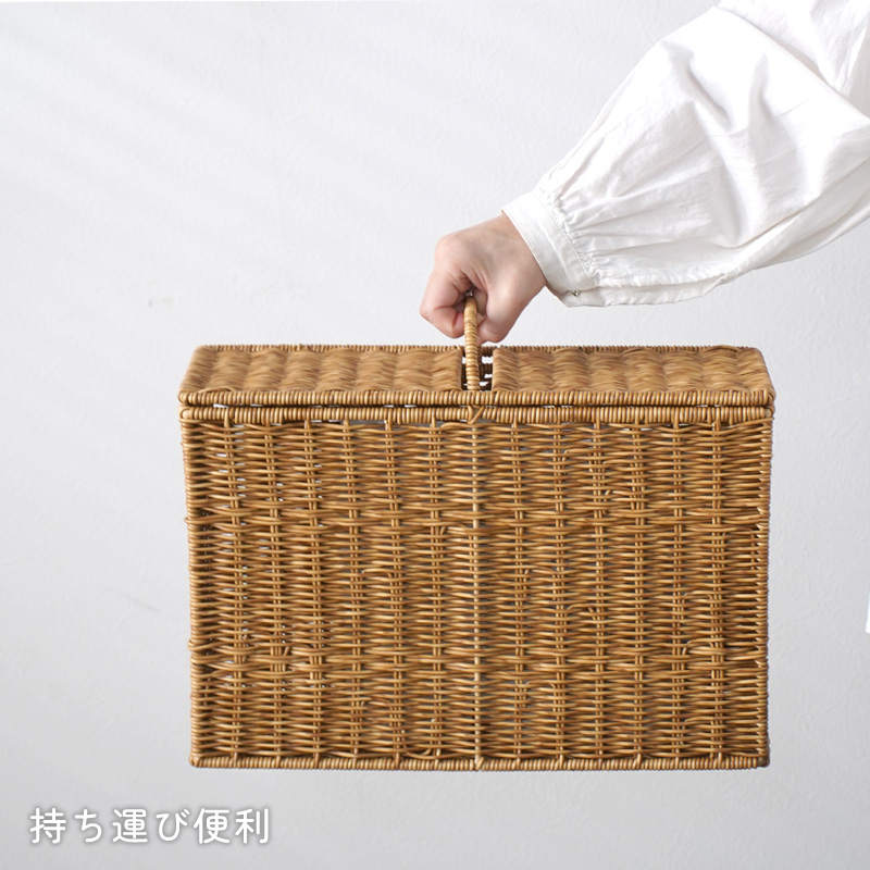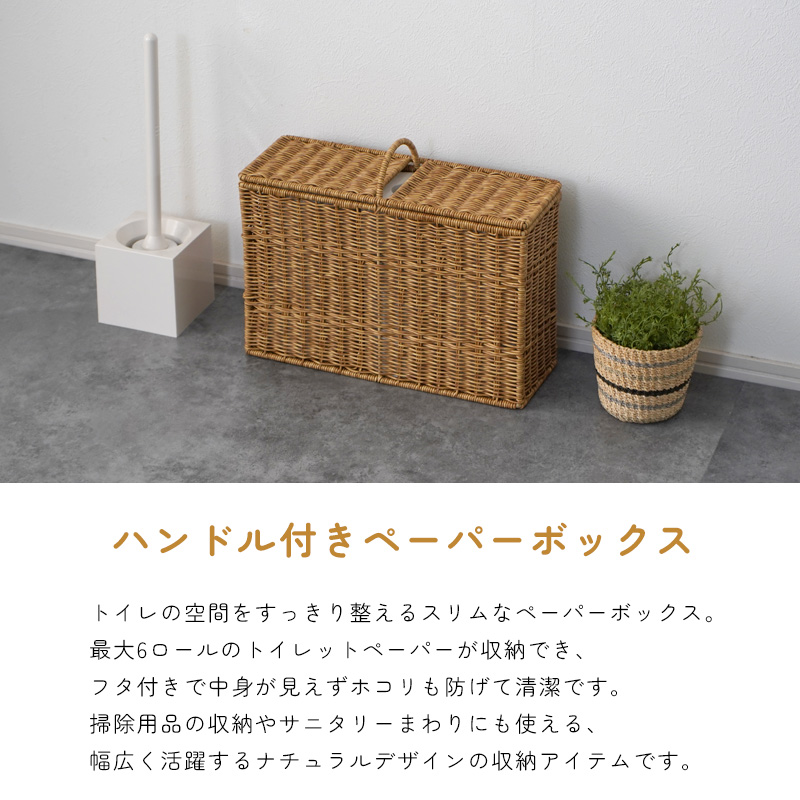| まるで天然素材の風合い 水洗いもできる UTILE ユティルシリーズ UTILE(ユティル)は、まるで天然素材のような風合いを持つ、ラタン調の収納シリーズです。 水や汚れに強く、お手入れ簡単な樹脂素材 ポリプロピレン・ポリエチレンチューブで丁寧に編まれており、水や汚れに強く、お手入れも簡単です。 水洗い可能で衛生的 汚れても水で丸洗いできるため、清潔を保ちやすく、洗面所やトイレなどの水まわりにも最適です。 生活感を隠せる、ナチュラルな見た目 美しいラタン調のデザインは、トイレットペーパーなどの生活感を隠しながら、空間に温かみと統一感を与えます。 スリムでもしっかり収納、ハンドル付きで便利 奥行約14cmのスリム設計ながら、トイレットペーパーを最大6ロール収納可能。フタ付きで中身が見えず、ホコリもガード。ハンドル付きで移動や掃除もスムーズです。 さまざまな場所で活躍する収納アイテム サニタリー用品や掃除グッズ、玄関まわりの小物、リビングのこまごまとした物もすっきり収納可能。暮らしのあらゆる空間で便利に使える万能ボックスです。 | ||