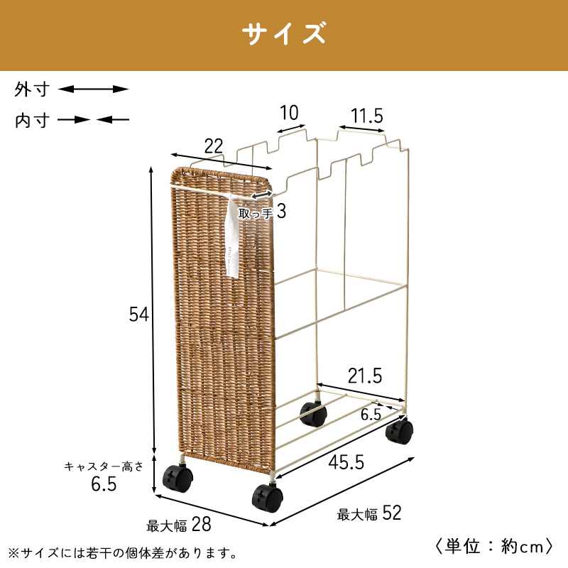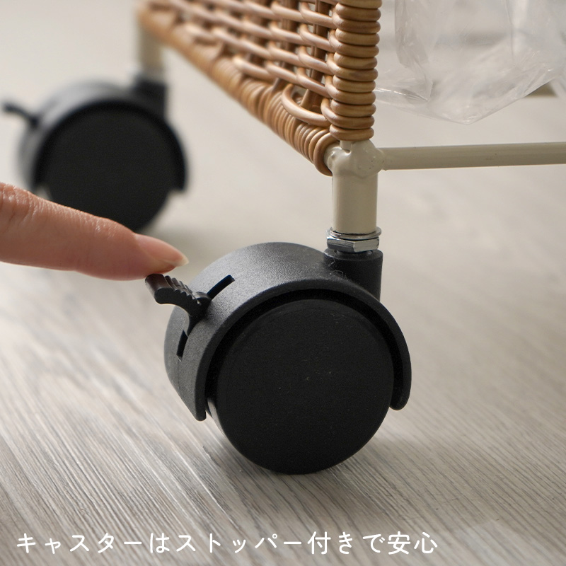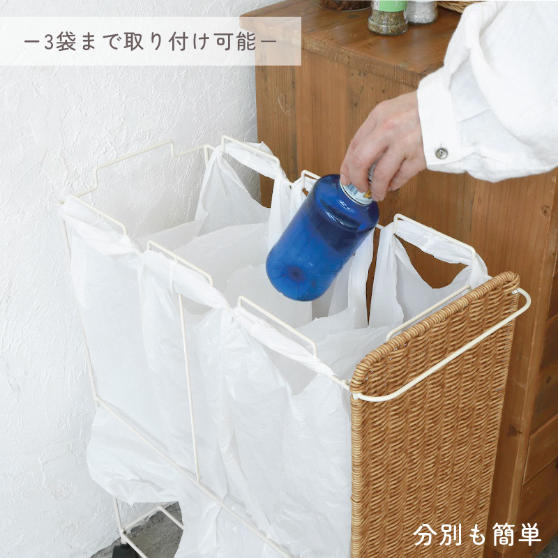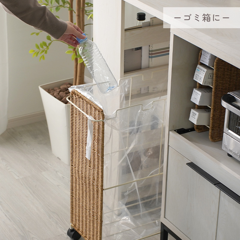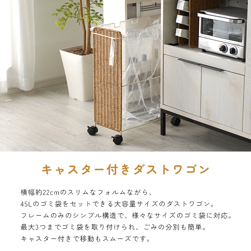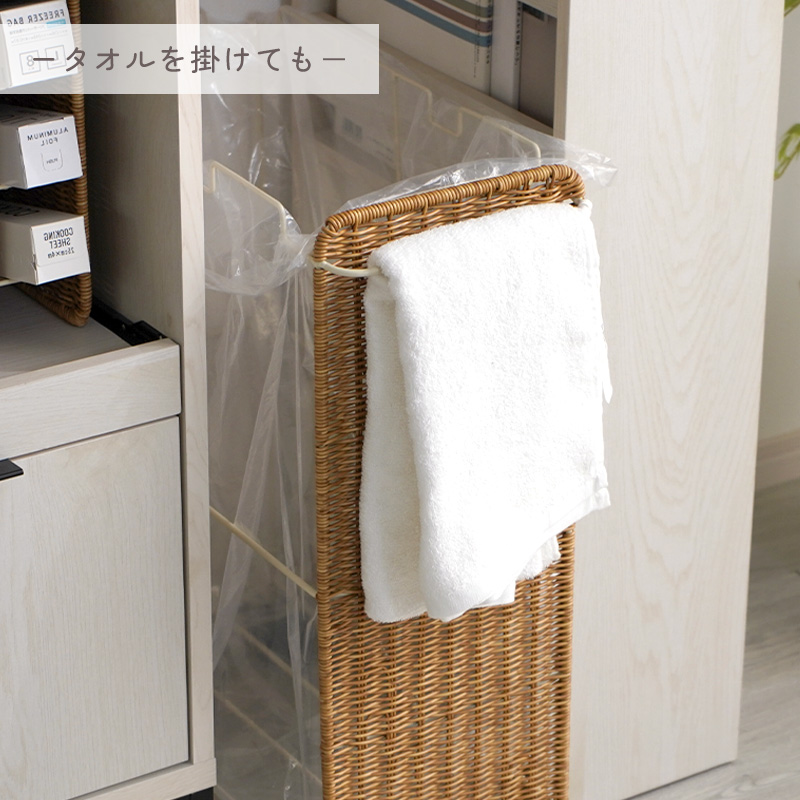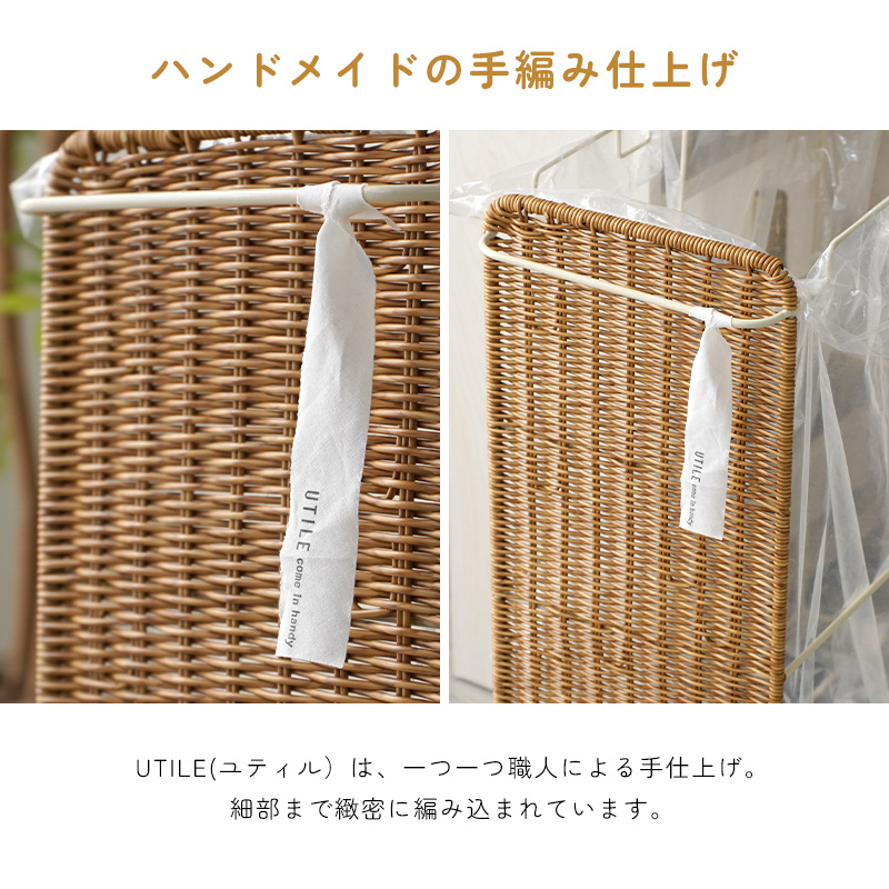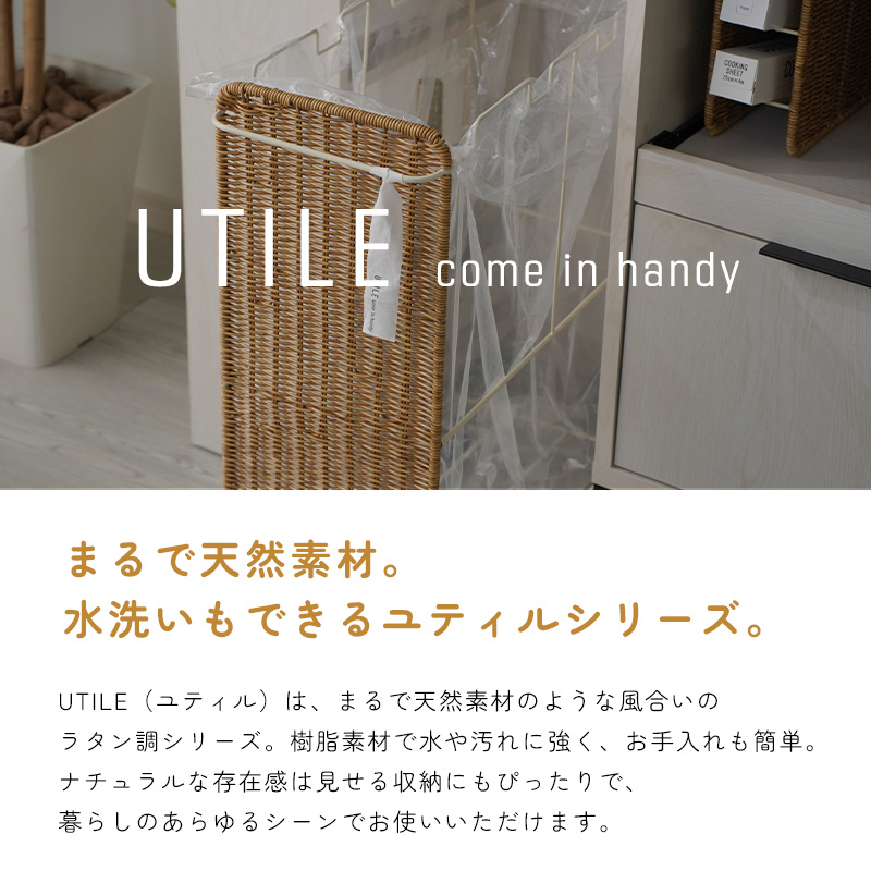 | まるで天然素材のような風合いと、水洗いできる手軽さが魅力のUTILE(ユティル)シリーズ。 ラタン調に編み込んだポリプロピレン・ポリエチレン素材を使用しており、水や汚れに強く、お手入れも簡単。ナチュラルであたたかみのあるデザインは、見せる収納にもよく馴染みます。 横幅約22cmのスリムなフォルムながら、 45Lのゴミ袋をセットできる大容量サイズのダストワゴン。 フレームのみのシンプル構造で、様々なサイズのゴミ袋に対応します。 最大3つまでゴミ袋を取り付けられ、ごみの分別も簡単。 取っ手にはタオルを掛けたり、フックを付けて小物を収納したりと、使い方も自由にアレンジできます。 キャスター付きで移動もスムーズ。ストッパー付きでしっかり固定もできます。 | |