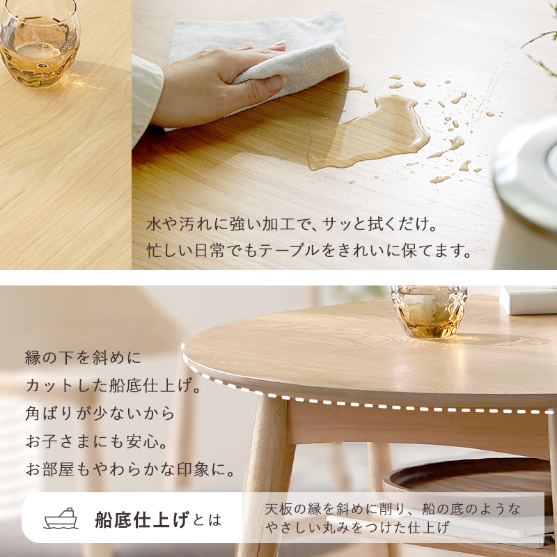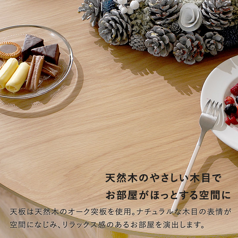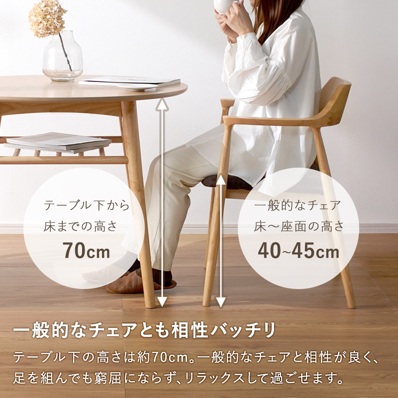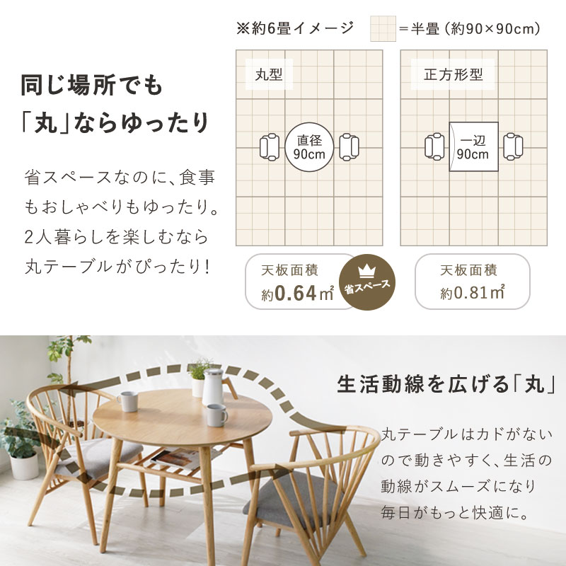 | やさしい丸みのあるフォルムと、あたたかな天然木の質感。 二人の時間を穏やかにくつろげる毎日をつくります。 同じ場所でも「丸」ならゆったり。省スペースなのに、食事 もおしゃべりもゆったり。2人暮らしを楽しむなら丸テーブルがぴったり! 丸テーブルはカドがないので動きやすく、生活の動線がスムーズになり毎日がもっと快適に。 親しい人との快適距離は約45cmと言われています。直径90cmのテーブルなら自然にその間隔がとれ、近すぎず遠すぎない関係で食事や会話が楽しめます。 | |